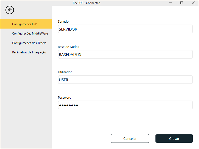 Neste ecrã, o utilizador deve definir os dados de ligação à base de dados do ERP, introduzindo o nome ou IP do servidor; o nome da base de dados; o utilizador de SQL pretendido e a password do mesmo.