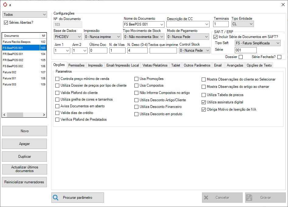 Nos documentos, deverão ser criados, o mesmo número de documentos de séries em uso e o mesmo número de tipos de documentos em uso. No campo SAF-T/ERP, série deve preencher a série correspondente do BeePOS.